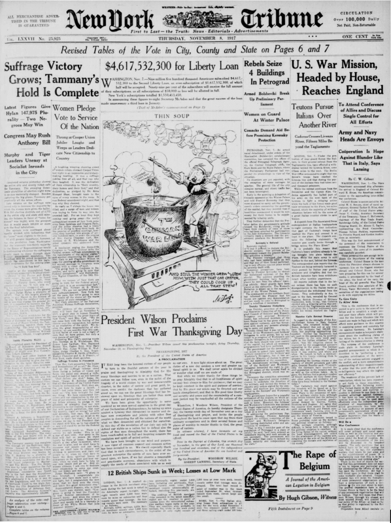 Asiler Petrograd’da 4 binayı ele geçirdi diye haber yapan Perşembe, 8 Kasım 1917 tarihli New York Tribune’ün ön sayfası.