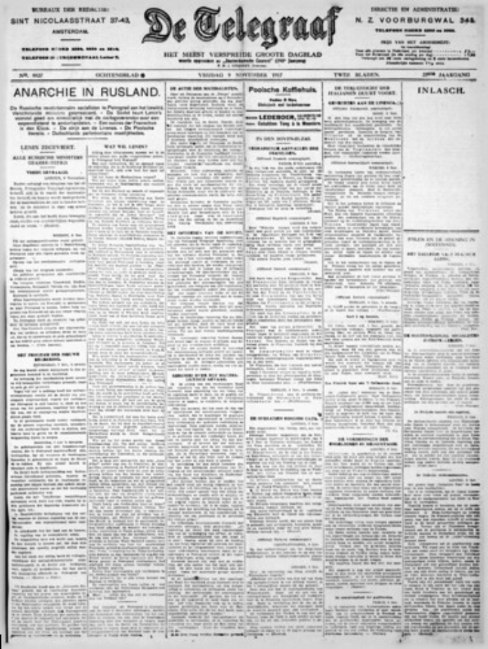 9 Kasım 1917 tarihli Hollanda gazetesi De Telegraaf, manşetten “Rusya’da anarşi, iktidar Lenin’de” başlığı atmış.