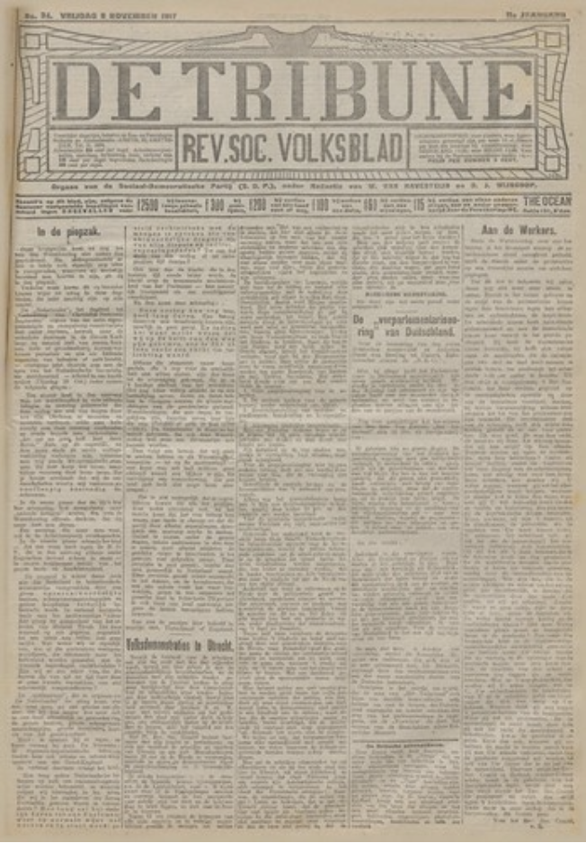9 Kasım 1917 tarihli Sosyal Demokrat Hollanda gazetesi De Tribune, Rusya’yla ilgili sürekli haber yapan gazetede hâlâ Kerenski hükümetine ilişkin tahliller yer alıyordu.
