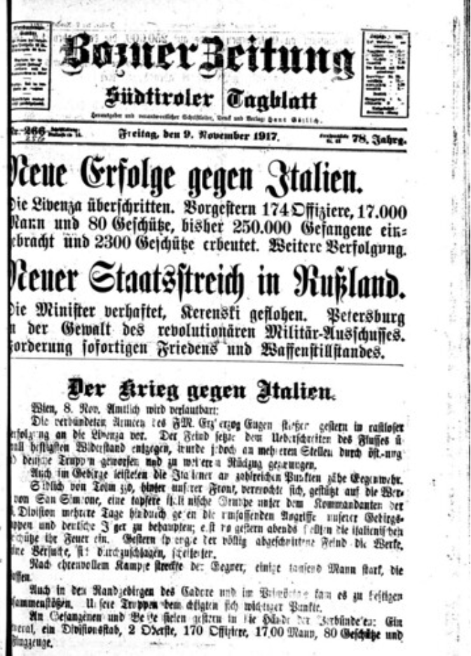 O sırada Avusturya-Macaristan İmparatorluğuna bağlı Tirol gazetesi Bozner Zeitung, 9 Kasım 1917’de, büyük manşetlerle “Rusya’da yeni darbe. Bakanlar tutuklandı, Kerenski kaçtı. Petersburg Askeri Devrimci Komite’nin eline geçti. Acil ateşkes ve barış talepleri. Aynı gazetenin 3. sayfasında Rusya’da Devrim başlıklı uzun bir makale yer aldı. Viyana St. Petersburg kaynaklı haberler, Lenin’in zaferinden, toplumsal devriminden, demokrasi taleplerinden ve eski bakanların tutuklanması ile Kerenski’nin kaçışından söz ediliyordu.