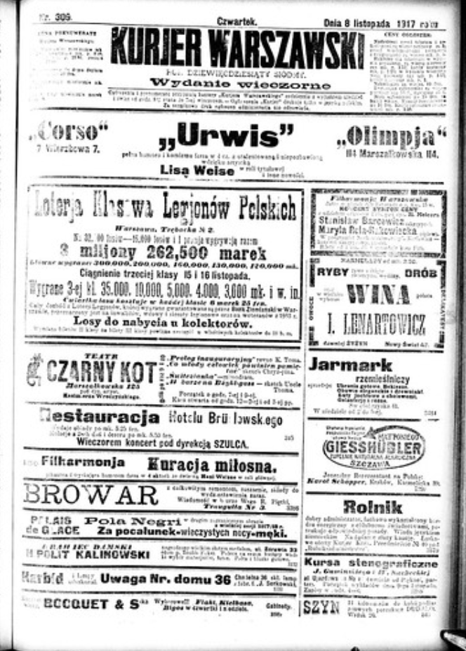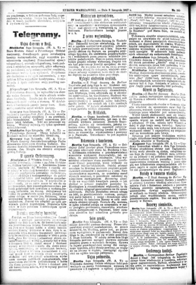 8 Kasım 1917 tarihli Polonya gazetesi Kurjer Warszawski. Gazetede 8 Kasım’da Stockholm’den gelen ve Rusya’da iç savaştan söz eden bir telgrafa dayanarak Ekim Devrimi ile ilgili ilk haber yapılmış.