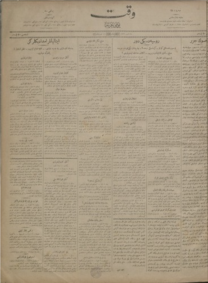 11 Kasım 1917 tarihli Vakit gazetesi. Vakit, aynı gün ön sayfasında “Rusya’da yeni çağ” başlığı atmış. St. Petersburg’da kanlı günler yaşandığı söyleyen yazı “Kerenski nerede?” diye soruyor. “İki gücün çarpışması: Savaş ve Barış. Lenin’in ültimatomu. Kışlık Saray’ın ele geçirilmesi. Devrimci Komiteler. İkinci bildiri. Askerlerin yağmaları.”
