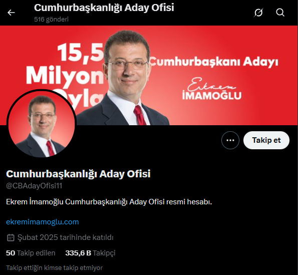 Ekrem İmamoğlu Cumhurbaşkanlığı Aday Ofisi’nin kullandığı yeni kullanıcı adı (CBAdayOfisi1) da, aynı gerekçeyle erişime engellendi ve karar internet servis sağlayıcılarına iletildi. X platformu 335 bin takipçili hesabı henüz Türkiye’den görünmez kılmadı.